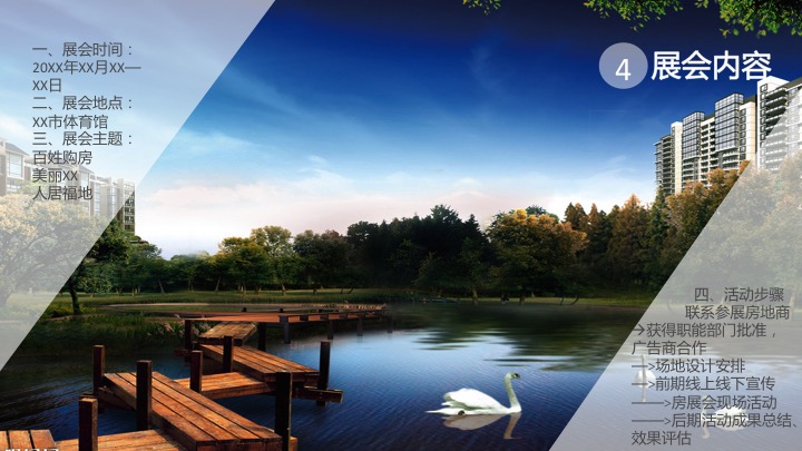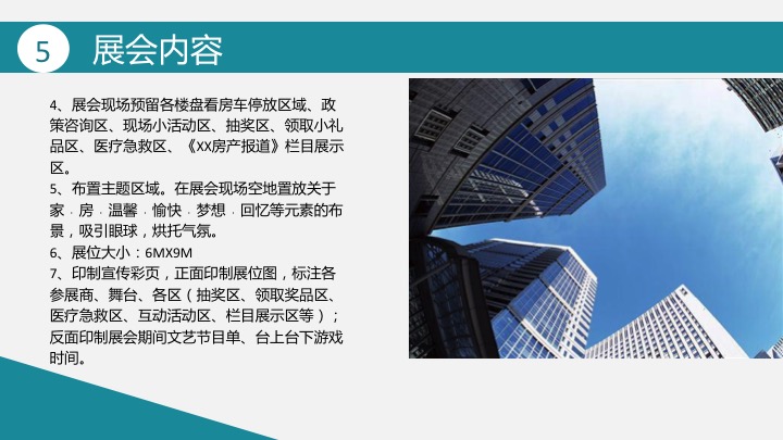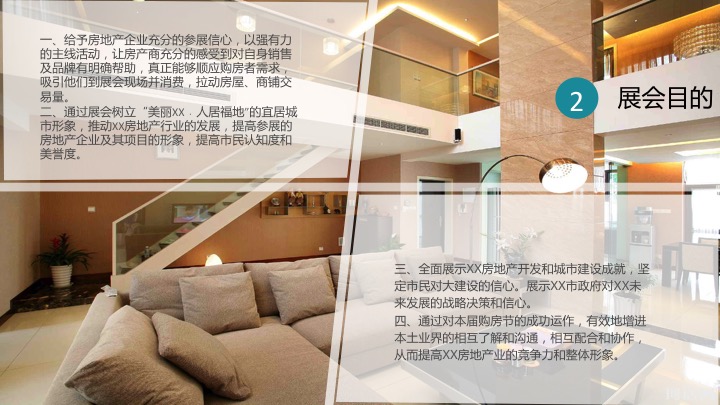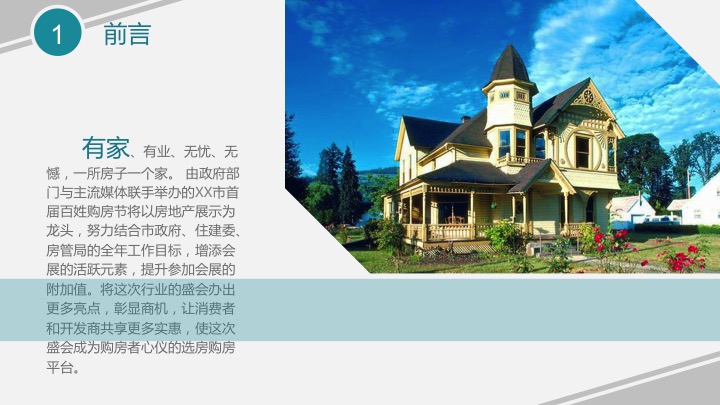 有家、有业、无忧、无憾,一所房子一个家。 由政府部门与主流媒体联手举办的XX市首届百姓购房节将以房地产展示为龙头,努力结合市政府、住建委、房管局的全年工作目标,增添会展的活跃元素,提升参加会展的附加值。将这次行业的盛会办出更多亮点,彰显商机,让消费者和开发商共享更多实惠,使这次盛会成为购房者心仪的选房购房平台。