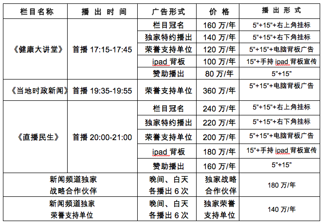 栏目资源——冠名、特约、赞助、电脑背板价格说明