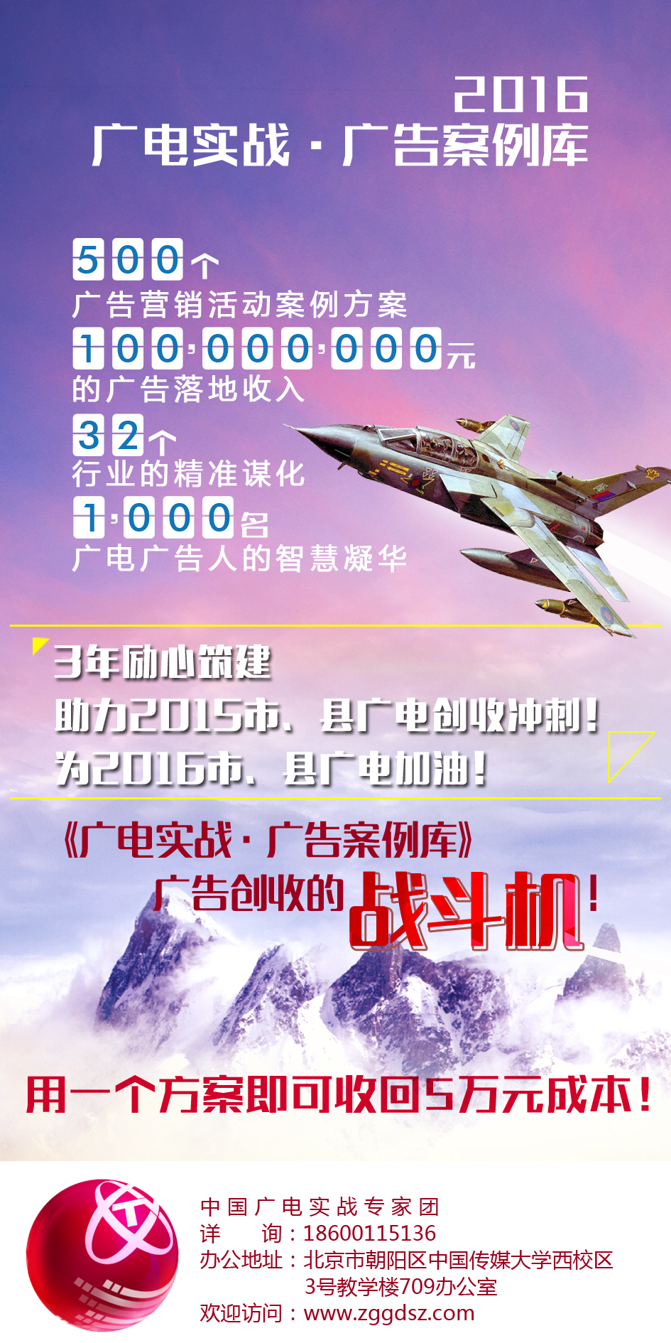 中国广播电视实战专家团,面向全国各级电视台隆重推出《2016广电实战广告案例库》。县级、市级、省级电视台:全国统一价格 5万/套。