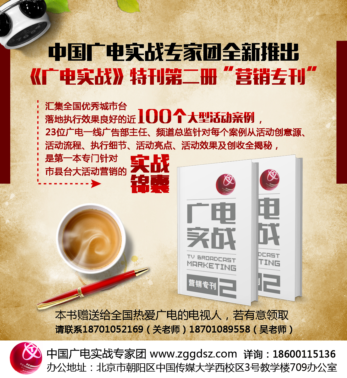 与此同时,一本集结23位全国城市台一线广告部主任、频道总监等分享的近100个大型活动案例的特刊,正在筹划出版。这是广电实战团队推出的第二本营销特刊,高勇坚持把这册全彩精装的实战宝典免费赠送给热爱广电的同行,帮助广电人在困苦的环境下快速成长。“只有大家团结起来,凝聚起集体的智慧,付出不亚于任何人的努力,才能把广电干好”。