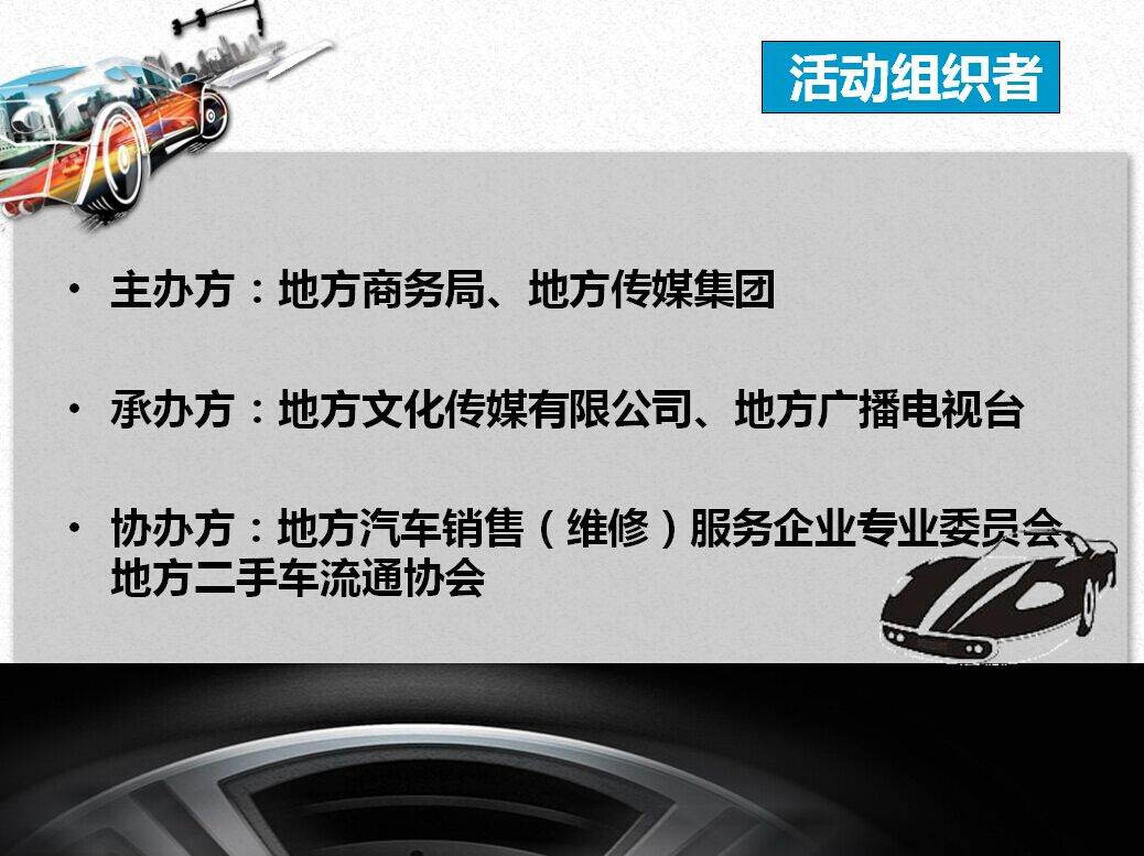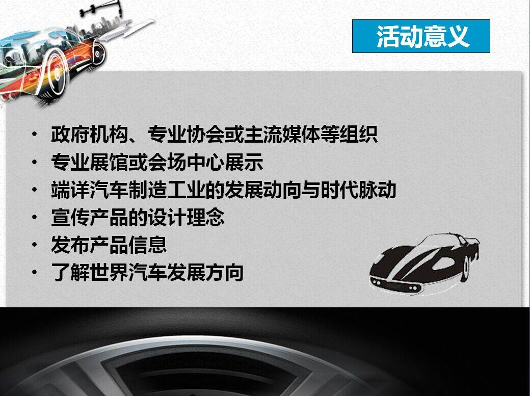 点击下载:活动意义:政府机构、专业协会或主流媒体等组织专业展馆或会场中心展示端详汽车制造工业的发展动向与时代脉动宣传产品的设计理念发布产品信息了解世界汽车发展方向广电实战专家团研发了全国最大的市县台大型活动案例库,详情咨询:18701051576