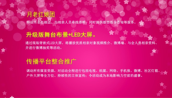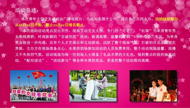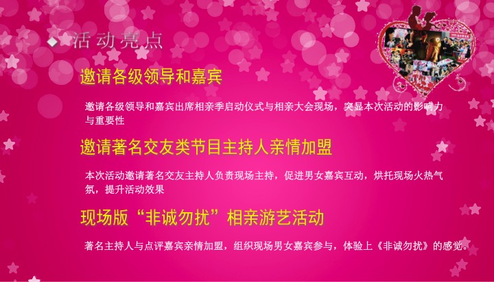 本次活动活动亮点层出不穷,现场互动交友大屏;专门的“月老”、“红娘”为单身青年男女牵线搭桥;时尚新颖的“非诚勿扰”活动;格调高雅、温馨私密的“8分钟约会”专区,为单身男女做进一步沟通;还有个人才艺展示和互动游戏,活跃了整个现场气氛,打破初次见面的陌生界限。主办方在现场准备点心、水果供到场参加活动的人员免费享用,整个活动现场温馨、浪漫又不失热烈气氛。活动现场为每一位到场人士准备了礼品丰厚的大礼包,每到整点时段的抽奖活动,“配对成功”、“活动参与”等各种丰厚的奖品,更是把整个活动推向高潮。