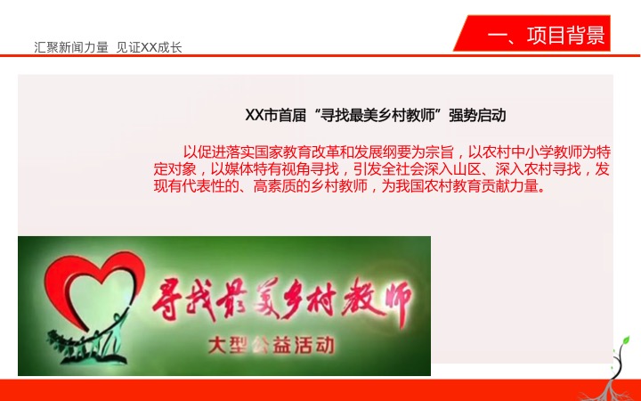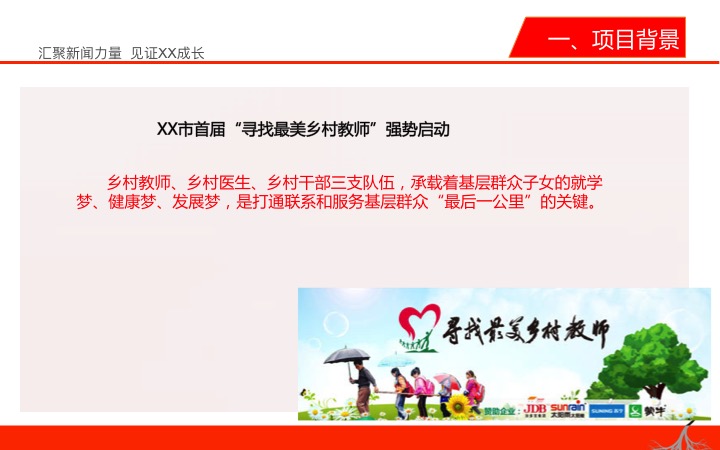 寻找“中国梦”-最美乡村教师。每个孩子的心中都有一个梦,当科学家、当艺术家、当军人、当老师......点燃并实现这个梦,离不开教师。在每个人成长过程中,老师扮演着重要角色。总会有那么一位记忆犹新的老师,给我们稚嫩的心底染上难以抹去的色彩。在每个人心中都有一位最美的乡村教师,开启了智慧之灯,照亮了孩子成长的航道。广电实战专家团研发了全国最大的市县台大型活动案例库,详情咨询:18701051576杨老师