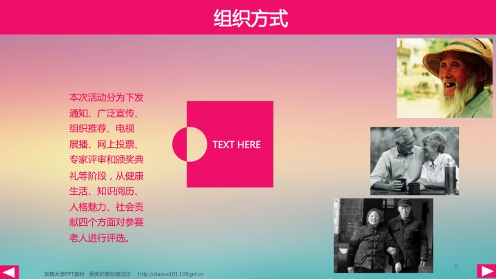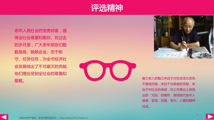 老年人是社会的宝贵财富,值得全社会尊重和敬仰。在过去的岁月里,广大老年朋友们勤勤恳恳、兢兢业业、忠于职守、任劳任怨,为全市经济社会发展做出了不可磨灭的贡献,他们理应受到全社会的尊重和爱戴。魅力老人的魅力来自于对生命活力孜孜不倦地挖掘,来自于对家庭的贡献、来自于对社会的奉献,在公共事业上表现出的“无私”的胸怀,展现现代老年人健康、智慧、优雅、有为、仁爱的精神风采。 广电实战专家团研发了全国最大的市县台大型活动案例库,详情咨询:18600115136张老师