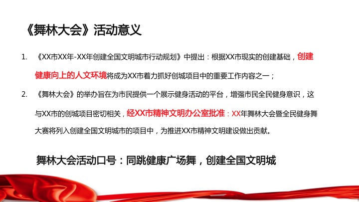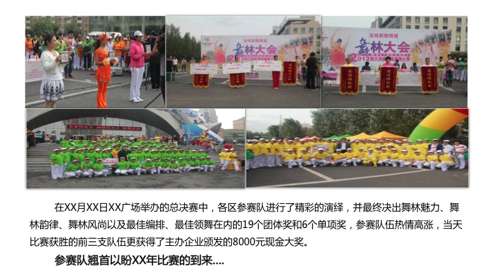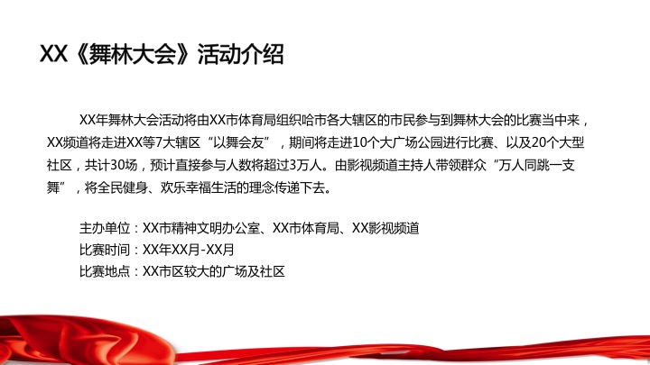 XX年舞林大会活动将由XX市体育局组织哈市各大辖区的市民参与到舞林大会的比赛当中来,XX频道将走进XX等7大辖区“以舞会友”,期间将走进10个大广场公园进行比赛、以及20个大型社区,共计30场,预计直接参与人数将超过3万人。由影视频道主持人带领群众“万人同跳一支舞”,将全民健身、欢乐幸福生活的理念传递下去。 广电实战专家团研发了全国最大的市县台大型活动案例库,详情咨询:18600115136 张老师