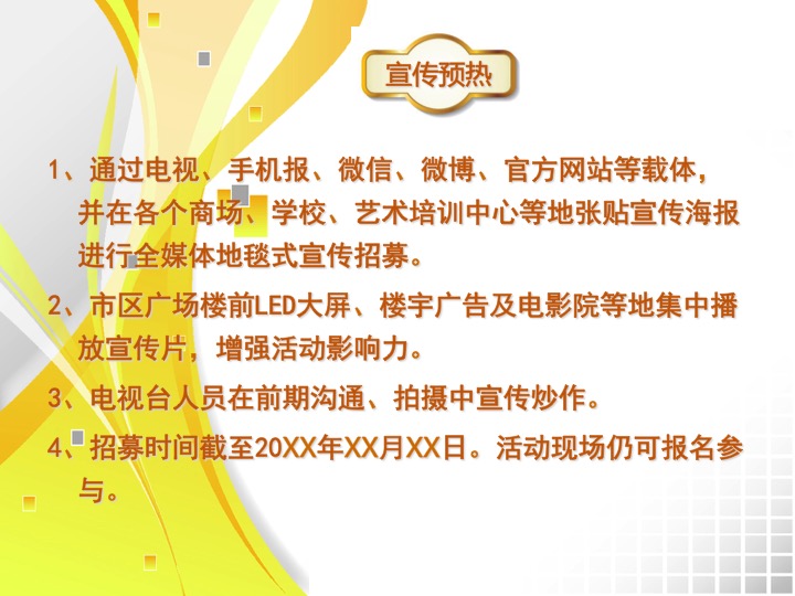 为广大市民提供一个展现自我的舞台,开拓市民眼界、提高素质、陶冶情操,帮助更多的市民全面提高道德素质、科学文化素质和身心健康素质。广电实战专家团研发了全国最大的市县台大型活动案例库,详情咨询:18600115136 张老师