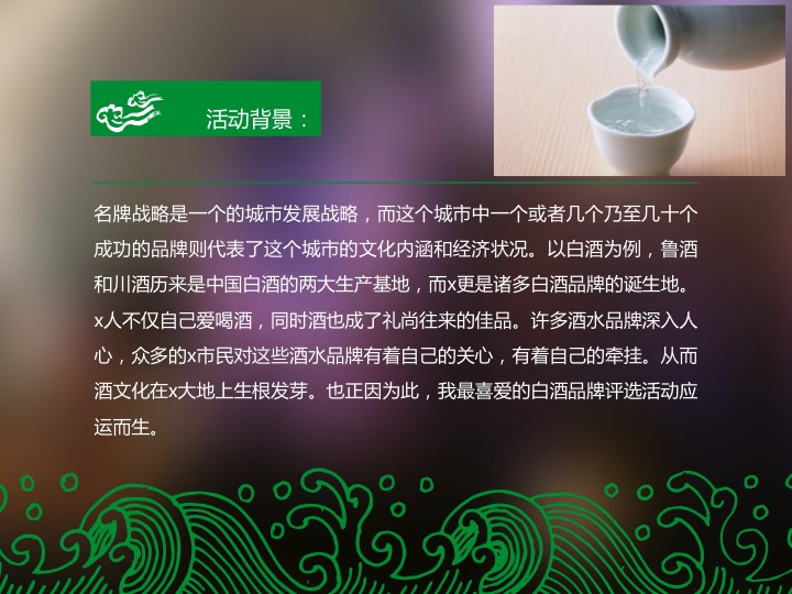 名牌战略是一个的城市发展战略,而这个城市中一个或者几个乃至几十个成功的品牌则代表了这个城市的文化内涵和经济状况。以白酒为例,鲁酒和川酒历来是中国白酒的两大生产基地,而x更是诸多白酒品牌的诞生地。x人不仅自己爱喝酒,同时酒也成了礼尚往来的佳品。许多酒水品牌深入人心,众多的x市民对这些酒水品牌有着自己的关心,有着自己的牵挂。从而酒文化在x大地上生根发芽。也正因为此,我最喜爱的白酒品牌评选活动应运而生。 .......如需完整案例请详询:18600115136张老师